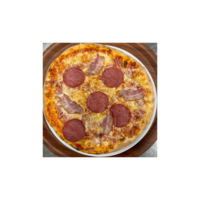 Kinkku, salami, pekoni, tomaattikastike ja juusto. Halutessasi voit lisätä valkosipulia ja oreganoa.